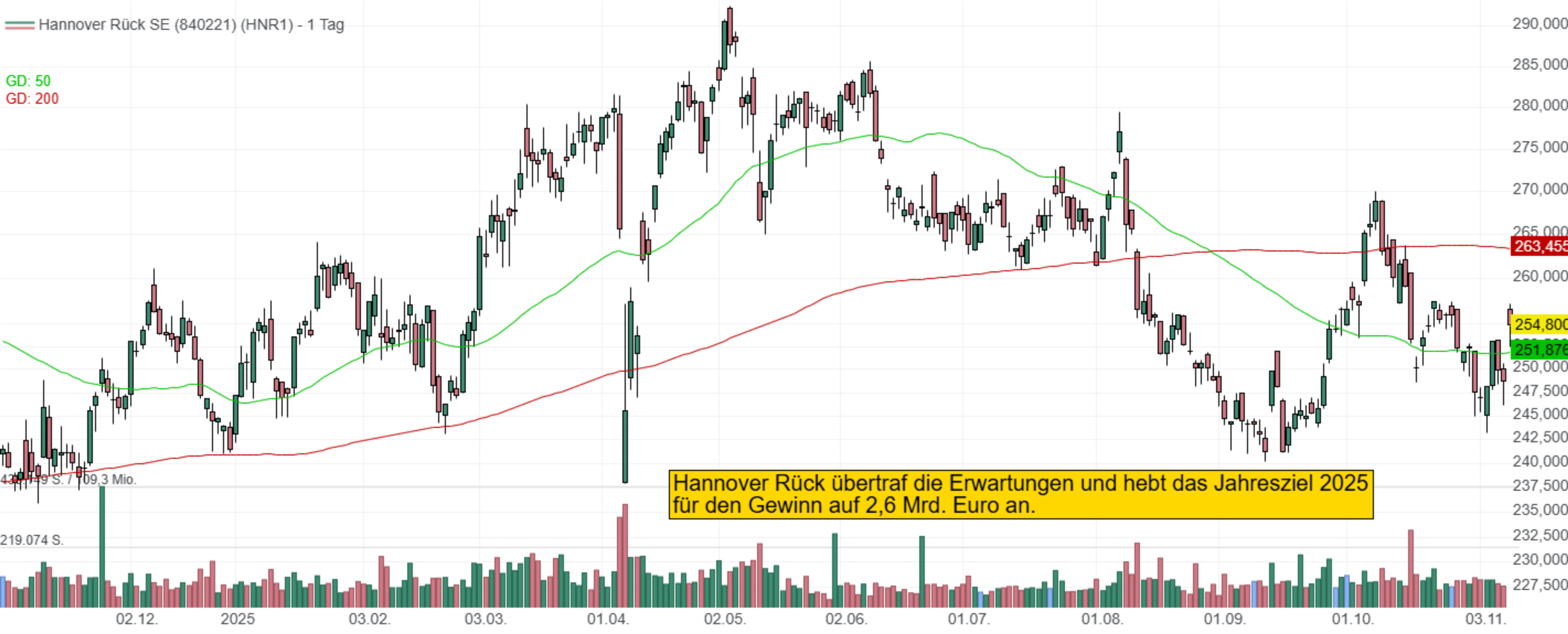 Die Hannover Rück SE (XETRA: HNR1) kann auf eine insgesamt sehr positive Geschäftsentwicklung in den ersten neun Monaten des Jahres 2025 zurückblicken. Der Konzern erzielte einen nahezu stabilen Rückversicherungsumsatz von 19,7 Mrd. Euro, während das Netto-Serviceergebnis um 12,1 % auf 2,39 Mrd. Euro zulegte. Das operative Ergebnis (EBIT) stieg auf 2,5 Mrd. Euro und der Nettokonzerngewinn um 7,7 % auf 1,96 Mrd. Euro. Angesichts dieser Dynamik hebt die Hannover Rück ihre Gewinnprognose für das Gesamtjahr auf 2,6 Mrd. Euro an. Auch die Eigenkapitalrendite von 22 % und eine Solvenzquote von knapp 259 % unterstreichen die hohe Ertragskraft und Stabilität des Rückversicherers.