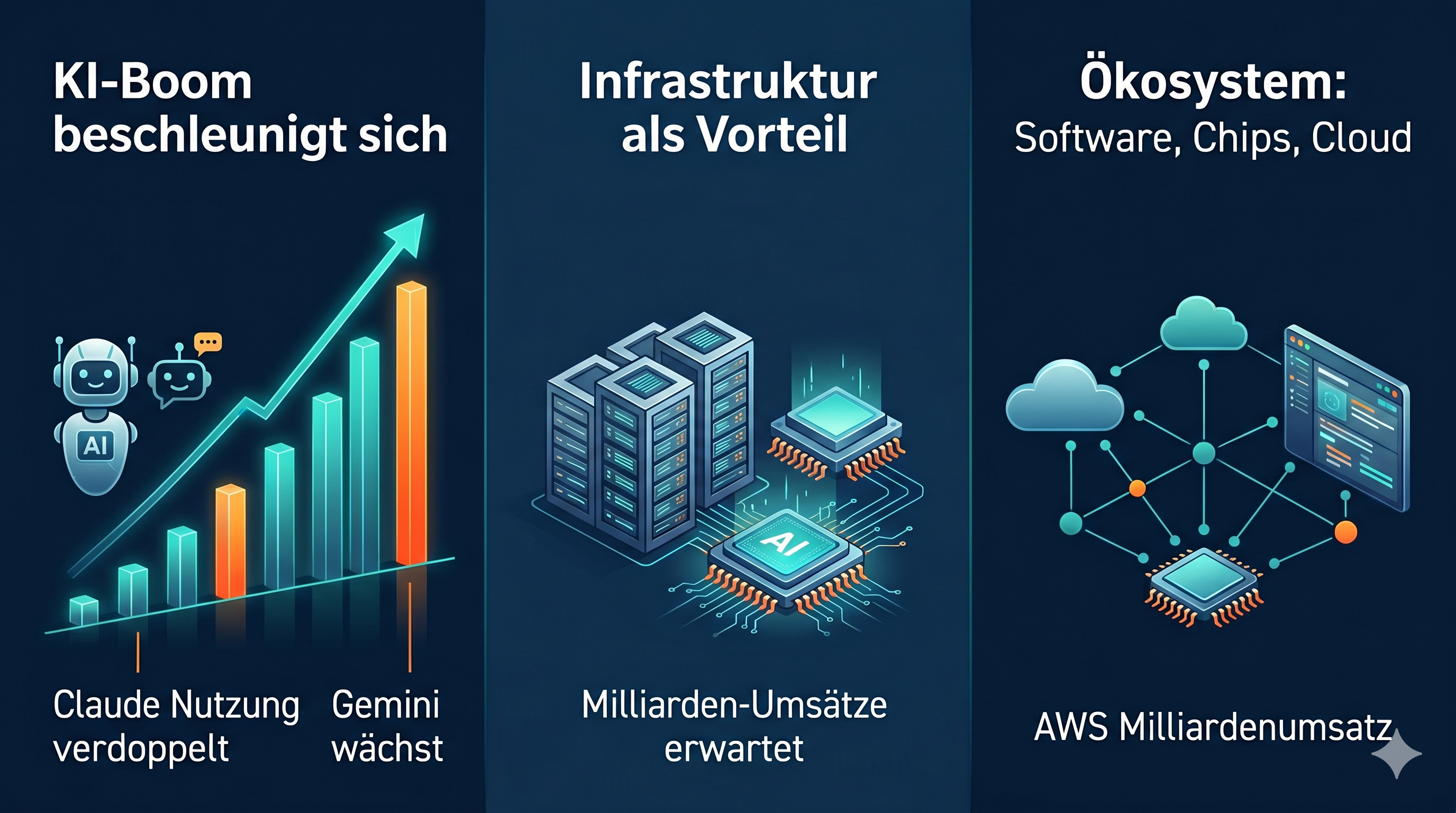 Neben der Software rückt vor allem die zugrunde liegende Infrastruktur in den Fokus. Alphabet stärkt seine Position durch eine Partnerschaft mit Broadcom zum Aufbau massiver Rechenkapazitäten für Anthropic. Dies unterstreicht die enorme Nachfrage nach KI-Rechenleistung und könnte langfristig zu zusätzlichen Umsätzen in Milliardenhöhe führen. Auch Amazon profitiert von diesem Trend, da Unternehmen verstärkt auf eigene Chips und Cloudlösungen setzen.