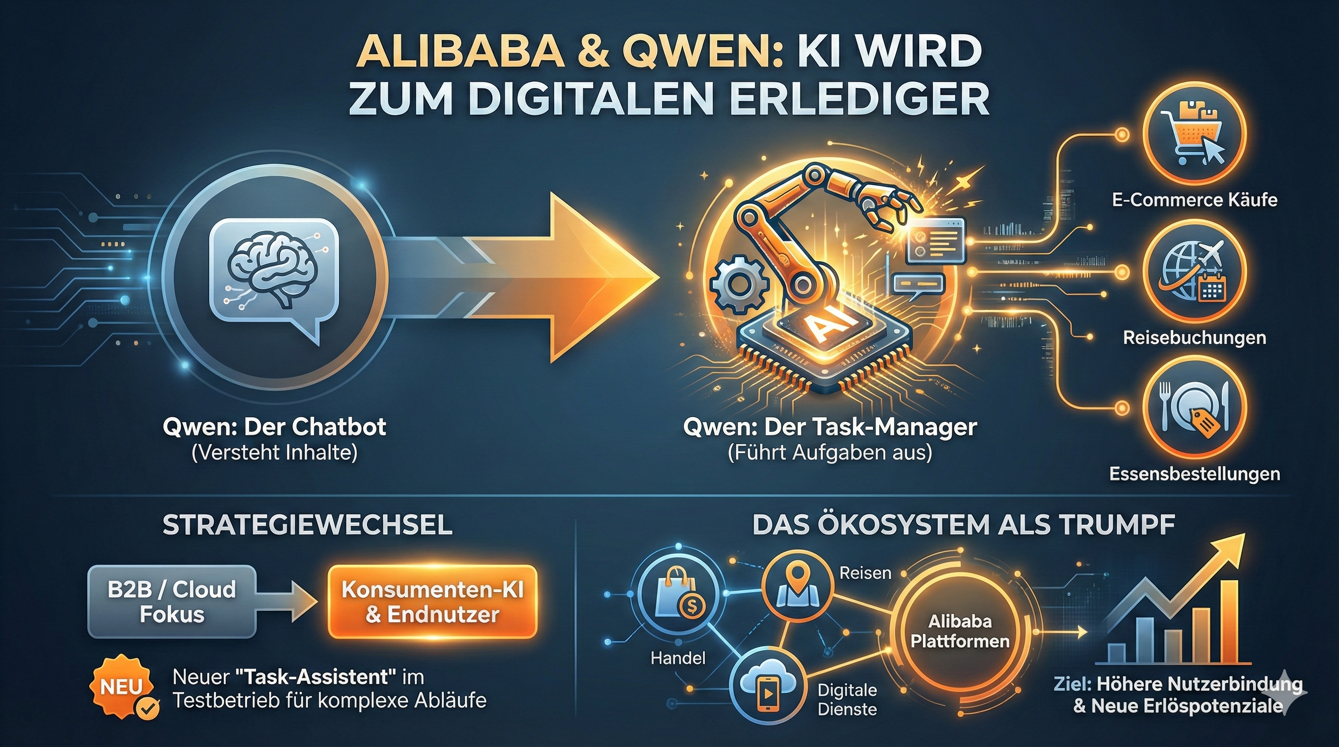 Der chinesische Technologiekonzern Alibaba treibt seine KI-Offensive voran und integriert den Chatbot Qwen deutlich tiefer in das eigene Plattform-Ökosystem. Mit dem neuen Update entwickelt sich Qwen vom reinen Gesprächspartner zum ausführenden Assistenten, der konkrete Aufgaben im Alltag der Nutzer übernimmt. Alibaba positioniert KI damit stärker als praktisches Werkzeug statt als bloße Zusatzfunktion.