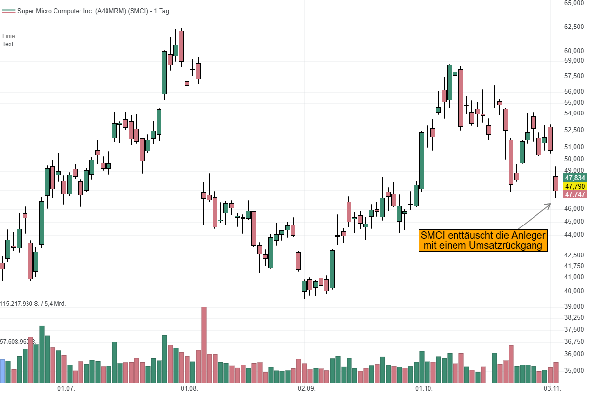 Am Dienstagabend geriet die Aktie von Super Micro Computer (SMCI) im nachbörslichen Handel unter Druck und verlor rund 9 %. Der Server- und Speicherhersteller aus San Jose verfehlte im ersten Quartal seines Geschäftsjahres 2026 die Markterwartungen deutlich. Der Umsatz lag mit 5 Mrd. USD rund 800 Mio. USD unter der Prognose von 5,8 Mrd. USD, was einem Rückgang von 15 % gegenüber dem Vorjahr entspricht. Auch beim Gewinn blieb Supermicro leicht hinter den Erwartungen zurück: Der bereinigte Gewinn je Aktie betrug 0,35 USD statt der erwarteten 0,39 USD.