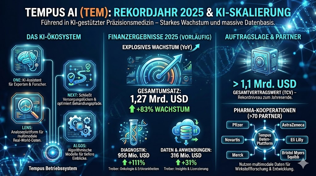Für 2025 legte Tempus starke vorläufige Zahlen vor. Der Umsatz stieg auf rund 1,27 Mrd. USD, ein Wachstum von etwa 83 % gegenüber dem Vorjahr, davon rund 30 % organisch. Das Diagnostikgeschäft entwickelte sich besonders dynamisch und wuchs auf etwa 955 Mio. USD an, getrieben durch mehr Tests in Onkologie sowie Erbkrankheiten. Der Bereich Daten und Anwendungen erzielte etwa 316 Mio. USD und legte um rund 31 % zu, wobei die Datenlizenzierung besonders auffiel. Gründer und CEO Eric Lefkofsky sprach von einem außergewöhnlichen Jahr, einer Beschleunigung in beiden Segmenten und einer starken Ausgangsposition für 2026, getragen durch Skaleneffekte und die steigende Bedeutung von KI im Gesundheitssektor.