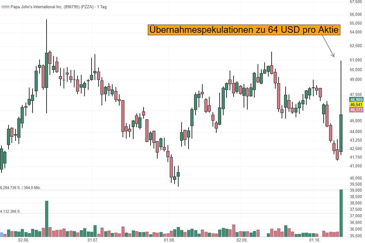 Die Aktie von Papa John’s stieg am Montag um 10 %, nachdem Berichte über ein Übernahmeangebot von Apollo Global kursierten. Demnach soll der Finanzinvestor 64 USD je Aktie für die Pizzakette bieten. Der Bericht löste sofort rege Spekulationen aus und katapultierte die Aktie auf das höchste Niveau seit Monaten.