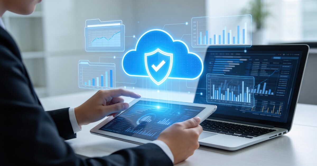 'post_title' => 'Cloud data security and protection concept with digital shield icon over tablet and laptop,secure storage backup and analytics for enterprise business technology',