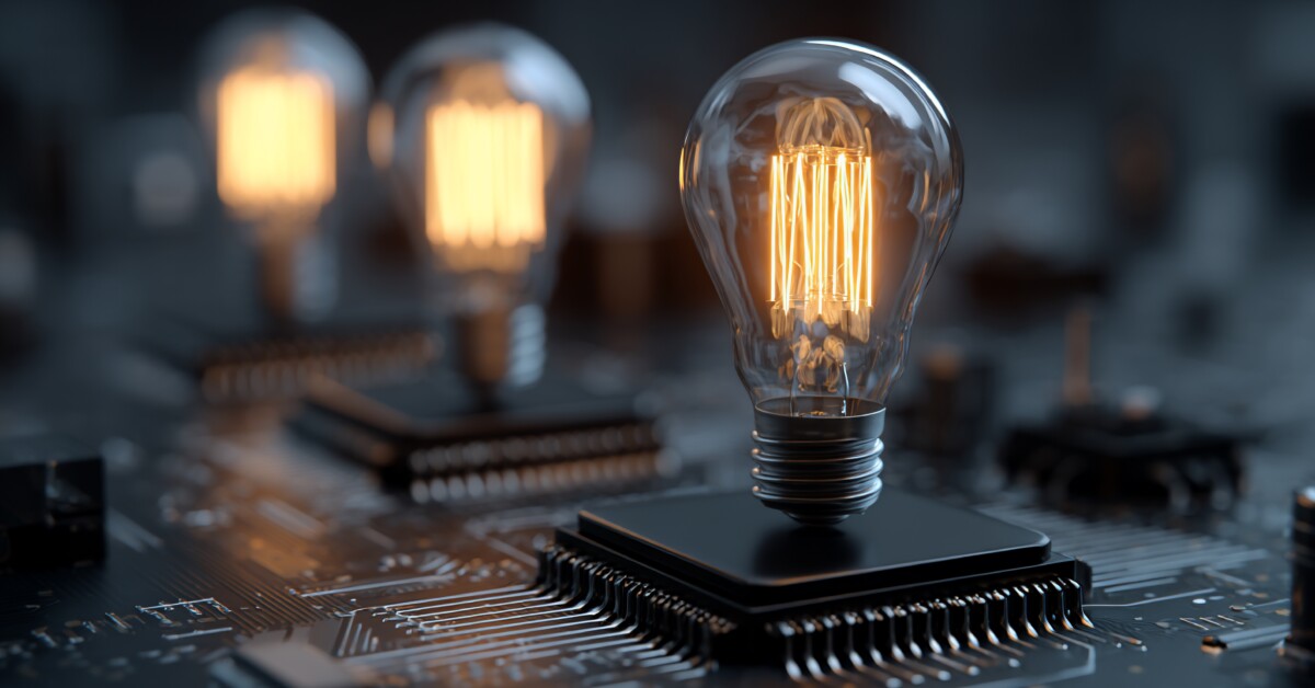 'post_title' => 'Illuminated lightbulbs on circuit board, symbolizing ideas, innovation',