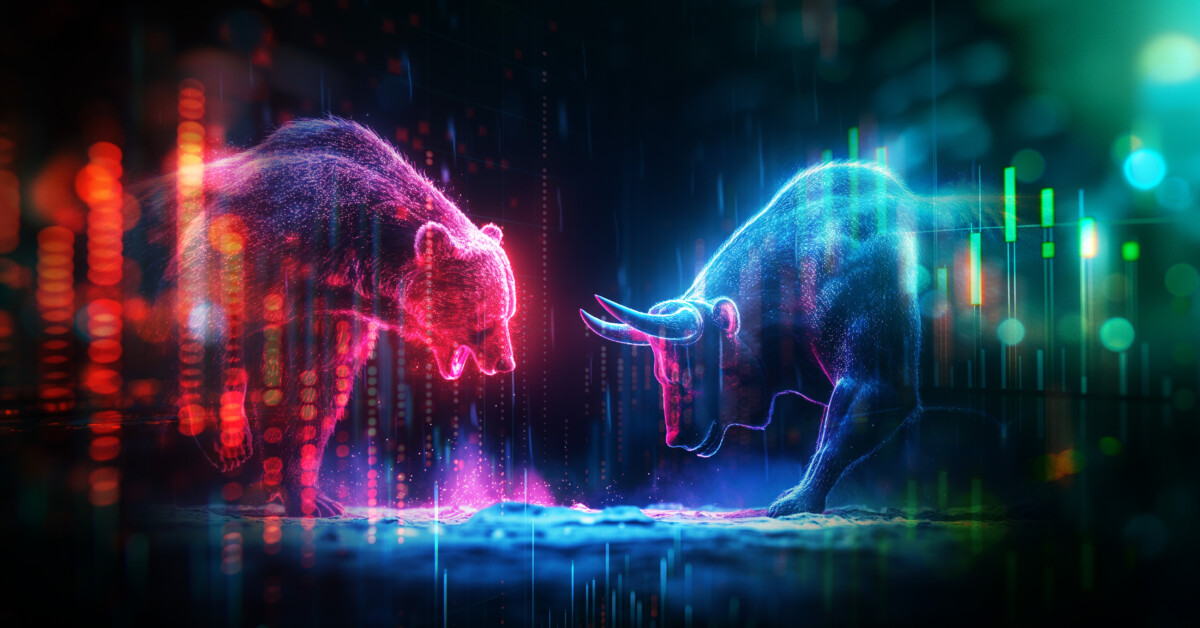 'post_title' => 'Bull and bear in digital hologram style, concept of stock market exchange or financial technology',