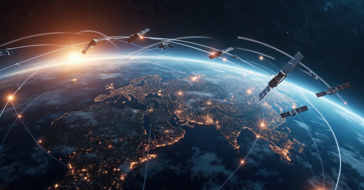 'post_title' => 'Dynamic 3D rendering of multiple satellites in orbit around Earth. Illuminated continents showcase global connectivity. Illustrates advanced space technology, communication networks. Complex orbital',