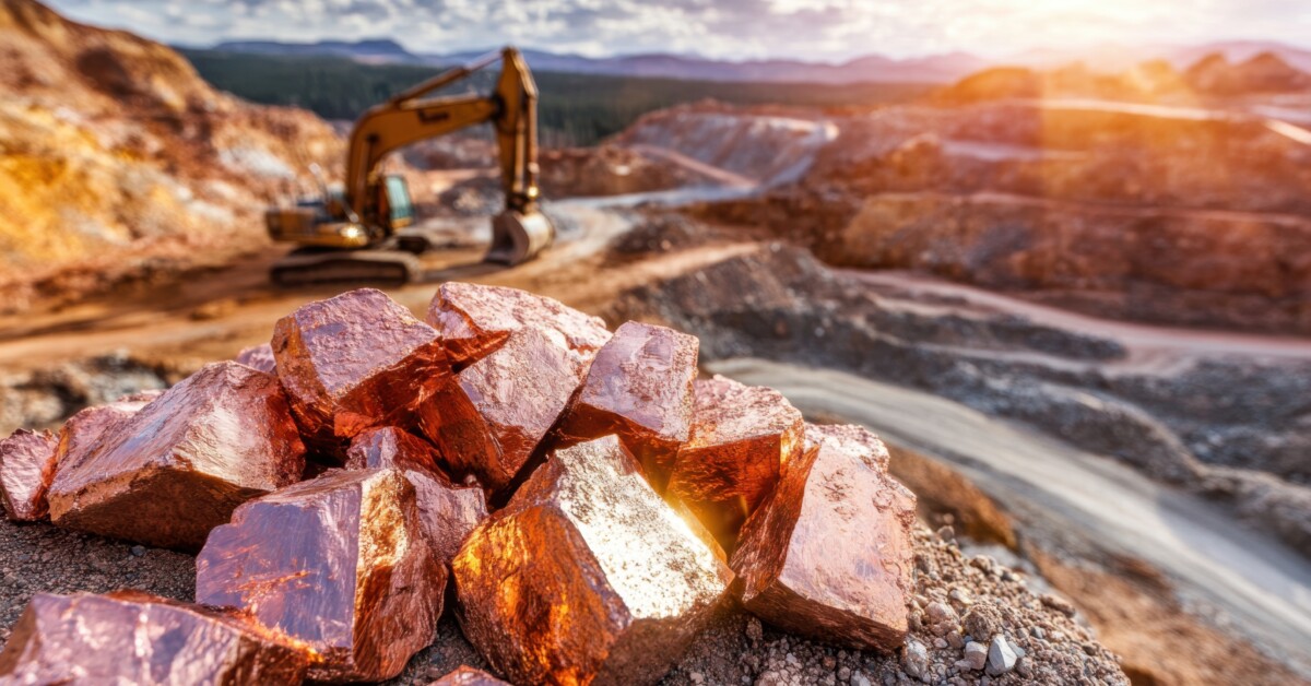 'post_title' => 'Copper mine with excavators working, raw copper pieces spread across ground, sunlight reflecting off mineral, capturing unrefined material essential for batteries',