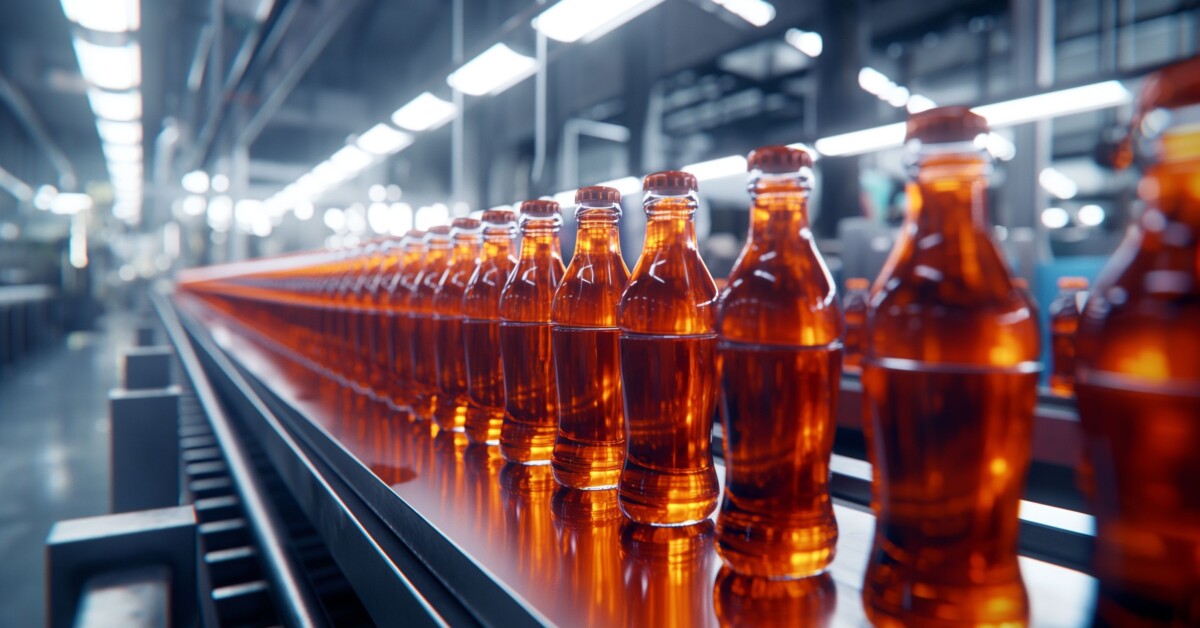 'post_title' => 'Bottles of beverage on a production line in a factory. Industrial and manufacturing concept.',