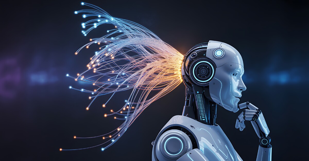 'post_title' => 'Side view of a humanoid robot with glowing fiber optic cables coming from its head on dark background',