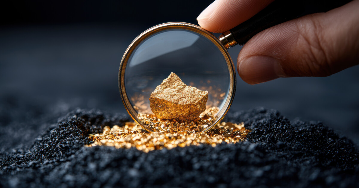 'post_title' => 'hand holding magnifying glass over piece of gold on bed of gold dust, showcasing intricate details and shine of precious metal. scene conveys sense of discovery and value',