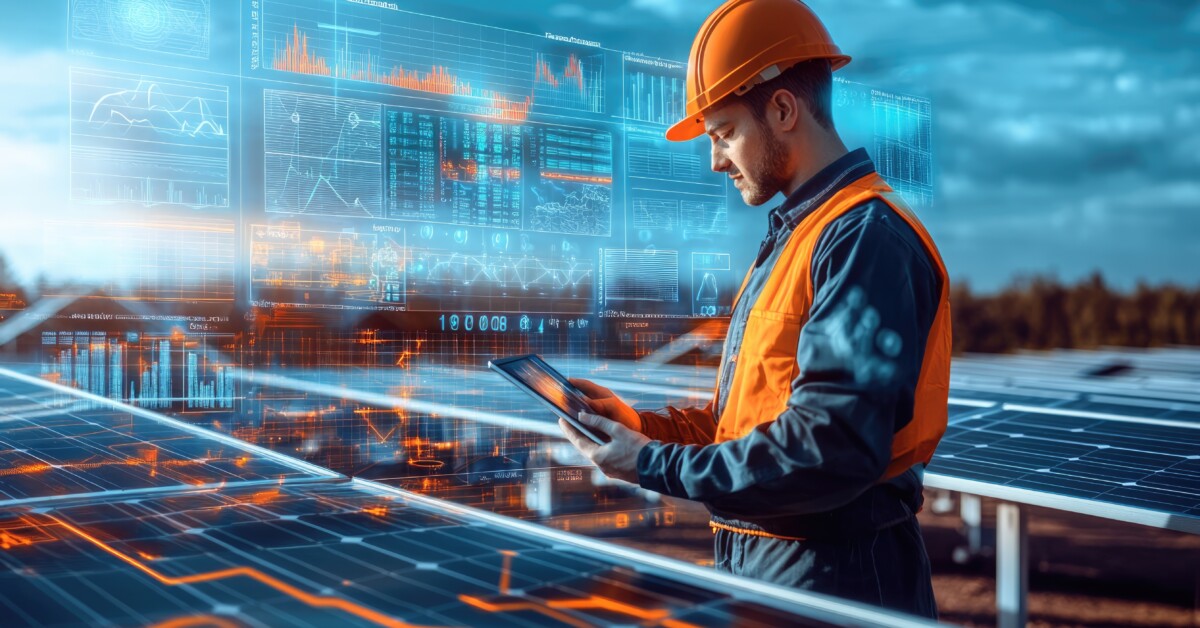 'post_title' => 'Very realistic and photographic photo of an engineer using a tablet at a solar farm, surrounded by futuristic holographic displays featuring intricate graphs and charts. The strategic theme is',