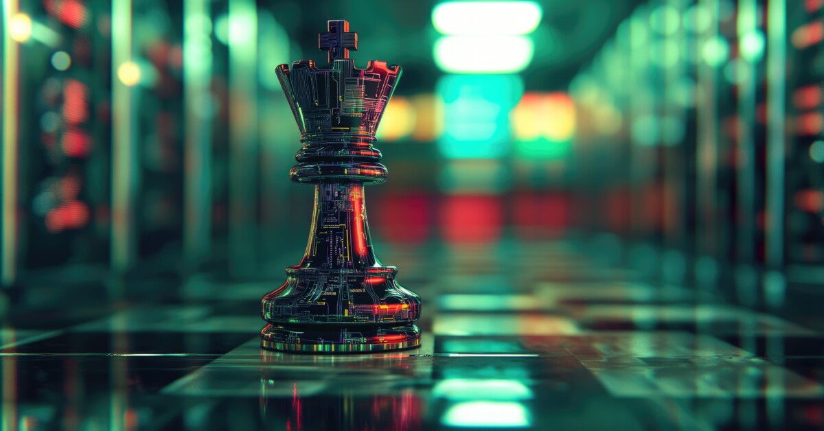 'post_title' => 'Futuristic Chess King Piece Surrounded by Abstract Digital Data Center Background Signifying Strategy and Technology Integration in Modern Gaming',