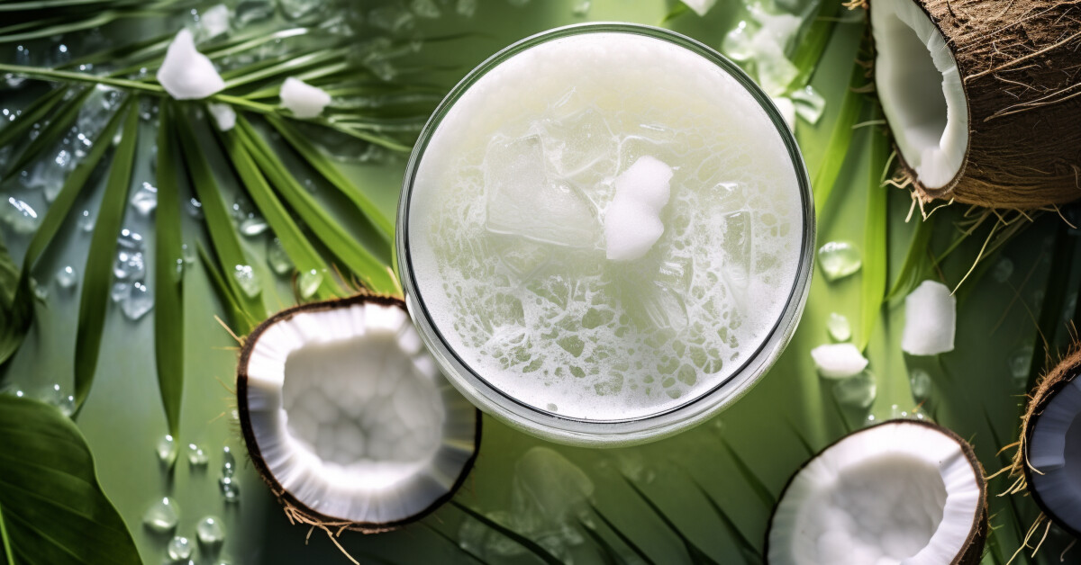 'post_title' => 'A frosty glass of Vita Coco Coconut Water condensation beading on the surface surrounded by fresh coconuts and palm leaves',